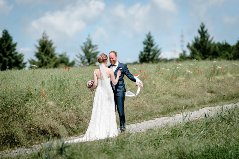 Aber nicht nur das würde ich zu den Highlights dieser grandiosen Feier zählen. Es gab einfach so viele schöne Momente. Beim Getting Ready von Charlotte wurde ich so herzlich in Empfang genommen und mit Hörnchen versorgt. Auch der First Look bei dem Julian seine Braut dann endlich in Empfang nehmen durfte war besonders emotional [themify_icon icon=“fa-heart“ link=“http://“ icon_color=“#b50000″] Das anschließende Portraitshooting mit den Beiden hat einfach nur Spaß gemacht und zum Abschluss wurde mein kleiner Corsa kurzerhand zum Brautauto gemacht – ich durfte die Beiden dann nämlich sogar zur Kirche fahren. Naja zumindest fast bis dorthin, um die Ecke wartete dann schon das ein bisschen coolere richtige Brautauto…